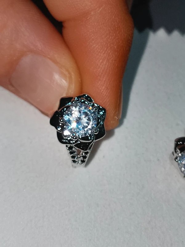 Moissanite taillé en rond de 0.7cm de diamètre tenu par 5 griffes et entouré par des pétales de plaqué or blanc