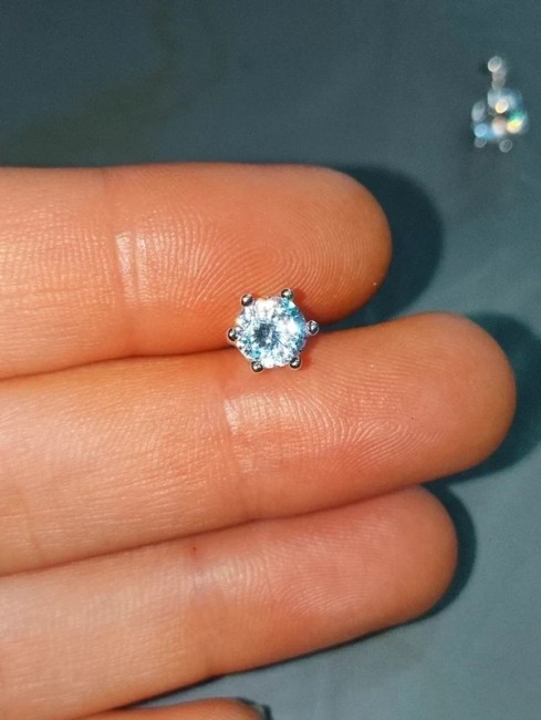 Une moissanite blanche de 1 carat par boucle d'oreille ( la moissanite est une pierre utilisée en joaillerie, mais l'extrême rareté des cristaux naturels — et leur pureté souvent très imparfaite — font qu'il s'agit toujours de moissanite synthétique, dont l'apparence et les propriétés sont très semblables à celles du diamant. Si la conductivité thermique très voisine des deux cristaux est susceptible de tromper une expertise fondée sur cette seule propriété) retenue par 6 griffes