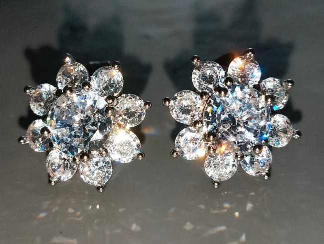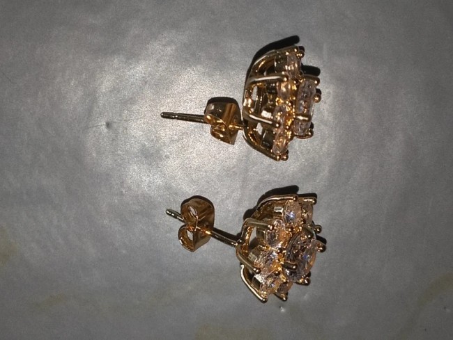 Au centre une moissanite blanche de 0.7cm de diamètre par boucle d'oreille ( la moissanite est une pierre utilisée en joaillerie, mais l'extrême rareté des cristaux naturels — et leur pureté souvent très imparfaite — font qu'il s'agit toujours de moissanite synthétique, dont l'apparence et les propriétés sont très semblables à celles du diamant. Si la conductivité thermique très voisine des deux cristaux est susceptible de tromper une expertise fondée sur cette seule propriété)