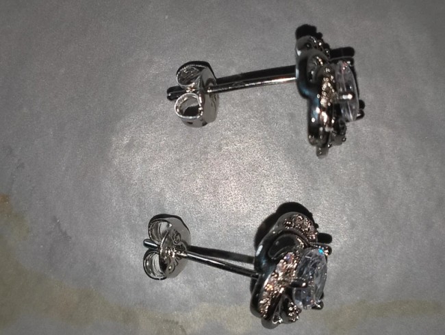 Au centre une moissanite blanche de 0.5 cm de diamètre par boucle d'oreille ( la moissanite est une pierre utilisée en joaillerie, mais l'extrême rareté des cristaux naturels — et leur pureté souvent très imparfaite — font qu'il s'agit toujours de moissanite synthétique, dont l'apparence et les propriétés sont très semblables à celles du diamant. Si la conductivité thermique très voisine des deux cristaux est susceptible de tromper une expertise fondée sur cette seule propriété)