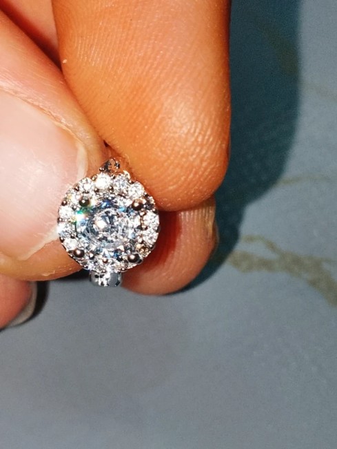 Moissanite ronde tenu par 4 griffes de 0.5cm de diamètre et entouré par un rond plus bas avec des petits zirconiums