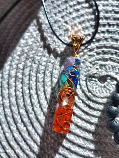 Pendentif de 4*1.6cm fait en résine avec plusieurs types de pierre naturelle à l'intérieur