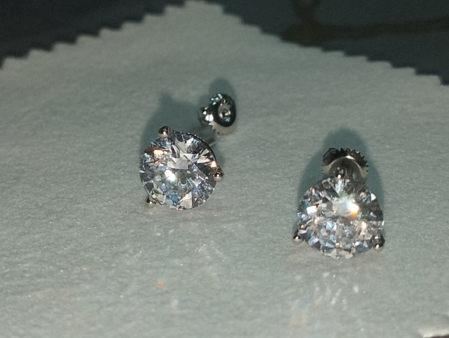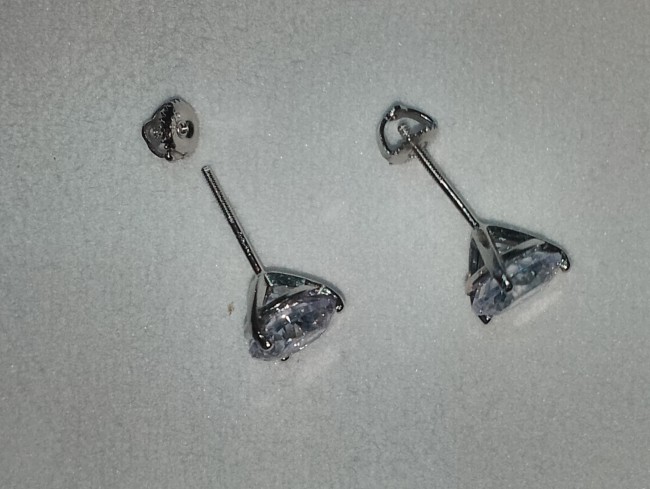 Une moissanite blanche de 0.8mm par boucle d'oreille ( la moissanite est une pierre utilisée en joaillerie, mais l'extrême rareté des cristaux naturels — et leur pureté souvent très imparfaite — font qu'il s'agit toujours de moissanite synthétique, dont l'apparence et les propriétés sont très semblables à celles du diamant. Si la conductivité thermique très voisine des deux cristaux est susceptible de tromper une expertise fondée sur cette seule propriété) retenue par 3 griffes