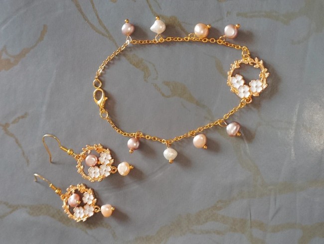 Bracelet en plaqué or 18 carats , base acier inoxydable, avec au centre le rond floral avec email blanc, 4 perles de culture naturelles de chaque côté ( violet , blanc rose nacrée)
