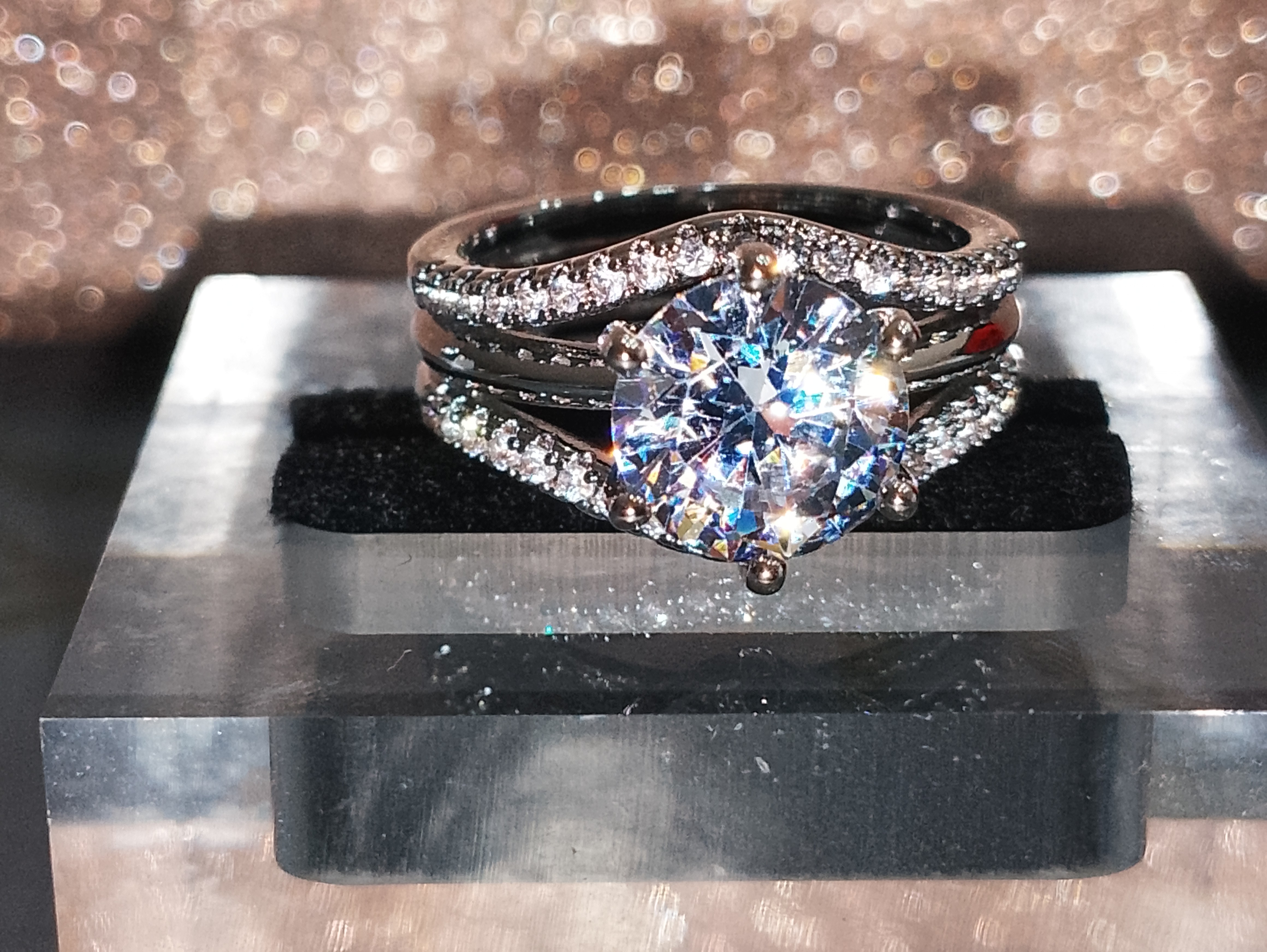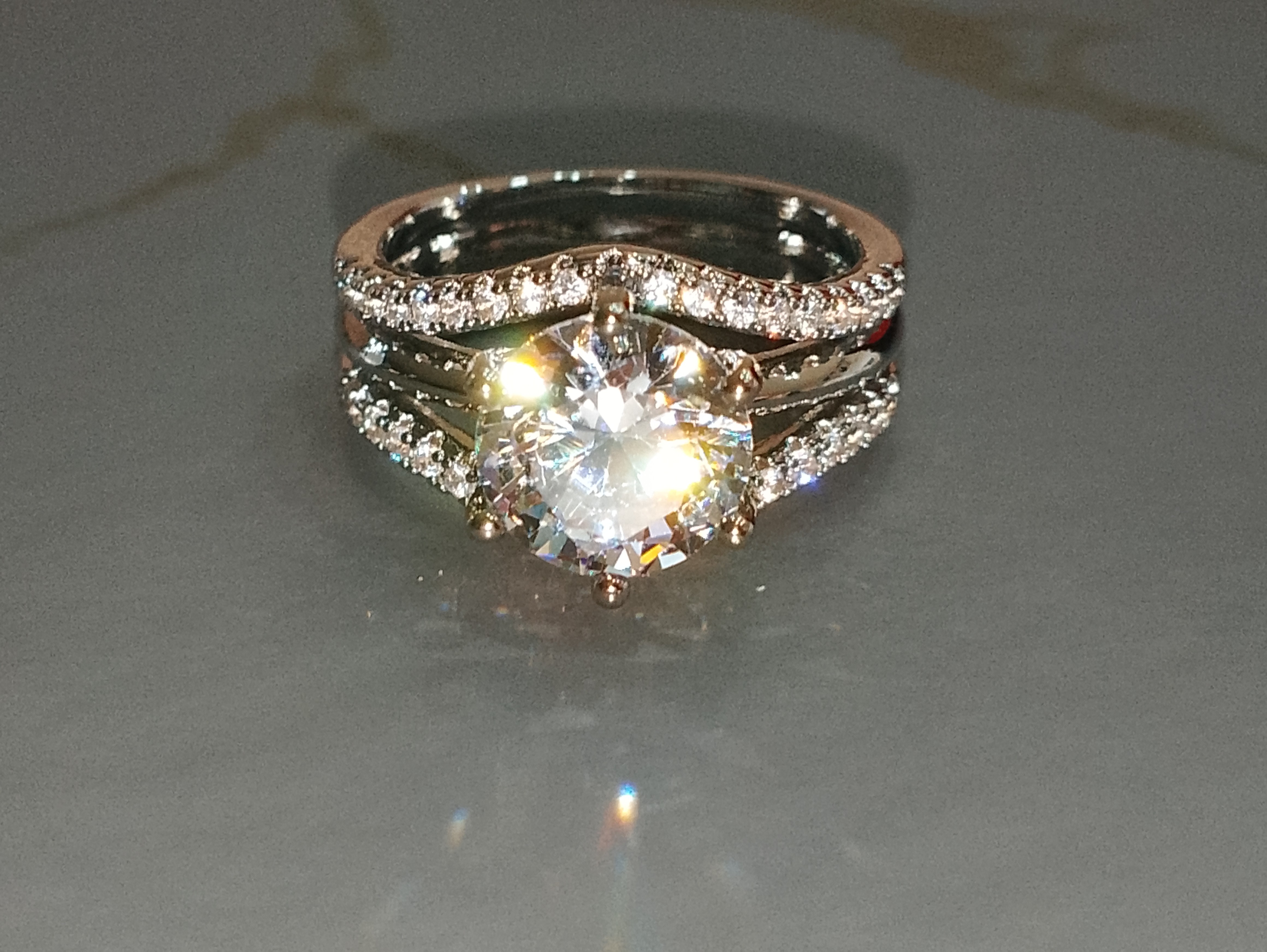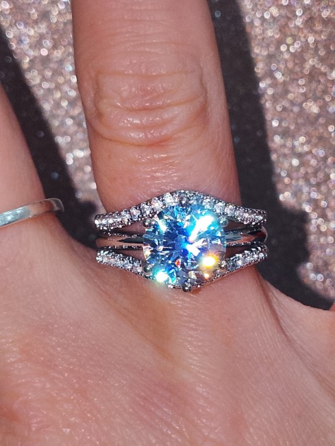 Moissanite ronde tenu par 6 griffes de 0.9cm de diamètre 2 lignes avec des petits zirconiums